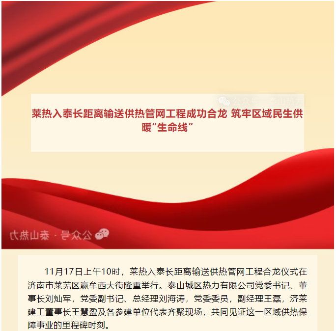 萊熱入泰長距離輸送供熱管網(wǎng)工程成功合龍 筑牢區(qū)域民生供暖“生命線”